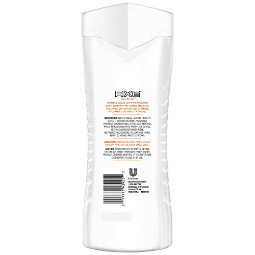 -. Binding : Health and Beauty -. Brand : AXE -. EAN : 0011111439252 -. Feature : Designed to get guys impeccably clean from head-to-toe / Crafted with unique, invigorating fragrances for the freshest start / Designed to help guys feel their finest / Complemented by a full range of axe white label grooming products -. Label : Unilever -. Manufacturer : Unilever -. Model : 10011111439259 -. PackageQuantity : 1 -. ProductGroup : Pantry -. ProductTypeName : BEAUTY -. Publisher : Unilever -. Studio : Unilever -. Title : AXE White Label Body Wash, Island, 16 Fluid Ounce -. UPC : 011111439252