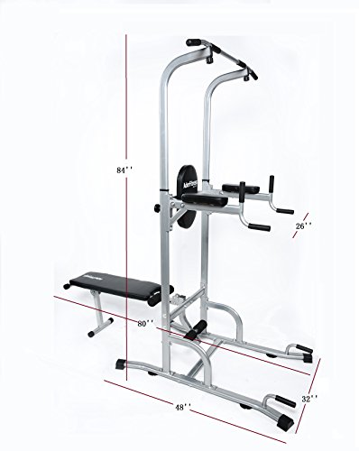 Studio : Ader Sporting Goods Publisher : Ader Sporting Goods Binding : Misc. Product Description *Built-in push-up bars for toning and a dip station to help increase your upper body strength. *Vertical knee raise station lets you perform leg and knee raises to build a ripped mid-section or to burn fat. *Dip station helps you develop your triceps and increase upper body strength. Flat bench perform dumbbell, body weight or core based exercises Recommended weight capacity: 250-pound including user. 0