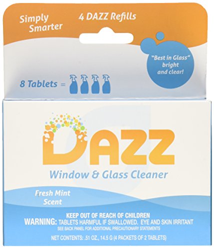 -. Binding : Tools & Home Improvement -. Brand : DAZZ Cleaning Tablets -. EAN : 0857338004008 -. Feature : 4 - DAZZ Refill Packets Makes (4) 32 oz bottles of DAZZ Window and Glass cleaner. Bottle not included / Concentrated cleaner in easy to use tablet form. Use your tap water and any 32 oz spray bottle / Highly effective household cleaner great for Windows, Glass, Mirrors, and Stainless Steel / Environmentally safe ingredients perfect for families with children and pets / Up to 75% less than traditional ready to use cleaners - save money with DAZZ -. Label : SunState Laboratories -. Manufacturer : SunState Laboratories -. Model : WGRF-001 -. MPN : WGRF-001 -. PackageQuantity : 1 -. PartNumber : WGRF-001 -. ProductGroup : Health and Beauty -. ProductTypeName : HARDWARE -. Publisher : SunState Laboratories -. Studio : SunState Laboratories -. Title : DAZZ Cleaning Tablets - Window & Glass Cleaner - 4 pack refill -. UPC : 857338004008