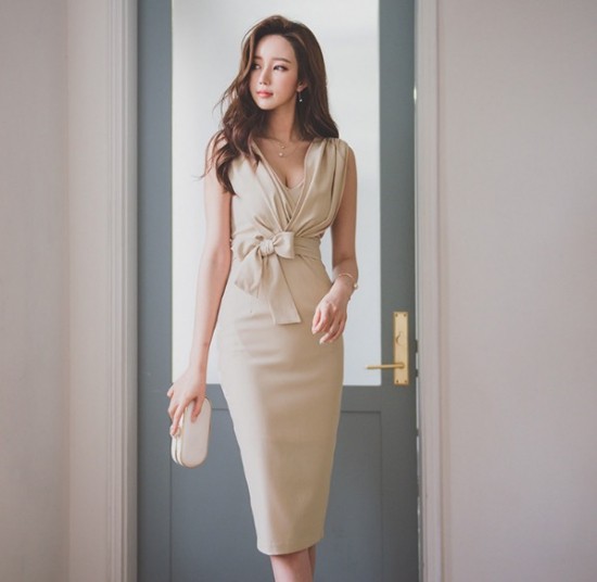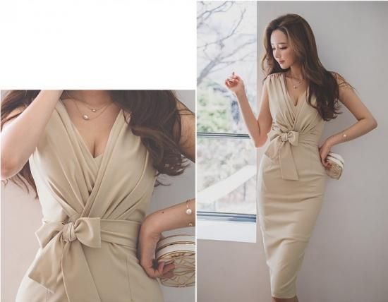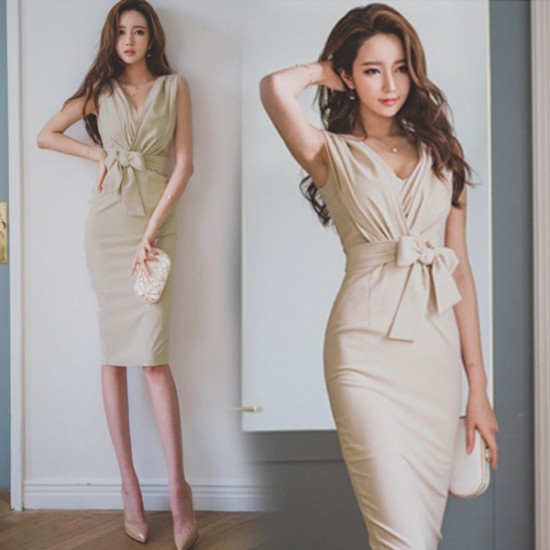 パーティードレス ひざ丈 ワンピース カシュクール タイト セクシー ラップドレス ベージュ ウエストリボン 大人 上品 お呼ばれ drgz2137