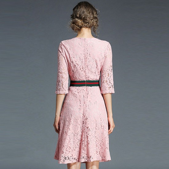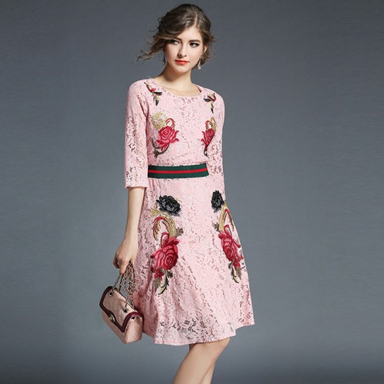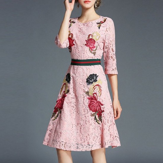 パーティードレス ひざ丈 ワンピース 花柄刺繍 花柄レース ピンク Aライン 七分袖 ウエスト切替 透け感 大人 上品 華やか お呼ばれ drgz2215