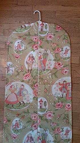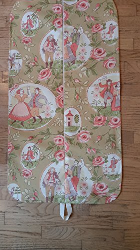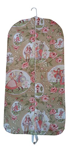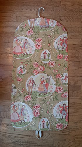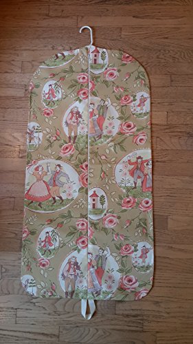 Product Description Ladies hanging garment bag in a happy toile on a khaki background. The colors included are rose pink, green and off white Made of 100 percent cotton and zips up the front with a grosgrain loop at the bottom. Cold water wash and hang to dry or dry clean. Great gift! One of my favorites! It can hold 3-5 garments or dresses and can be carried on the plane! 0