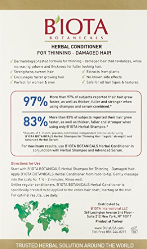 -. Feature : The number one requested item by BIOTA customers, this exceptional conditioner provides volume, shine and smoothness; nourishes and moisturizes the hair and scalp and provides an ideal environment for healthy hair. / Unlike regular conditioners, BIOTA Botanicals Advanced Herbal Care Conditioner is specially created to be applied to the entire hair shaft, starting at the root. / All of BIOTA Botanicals Advanced HerbalCare products contains our exclusive, scientifically- formulated Herbal BioComplex B11, a clinically tested combination of herbal extracts with naturally occurring minerals and essential fatty acids that work by nourishing the scalp. / This breakthrough herbal blend brings new hope to those who want to combat thinning-damaged hair, helping in the fight to maintain and encourage healthier, stronger, more resilient hair and can only be found in BIOTA products. / Our leading scientists and dermatologists are dedicated to researching and creating formulas that promote beautiful hair