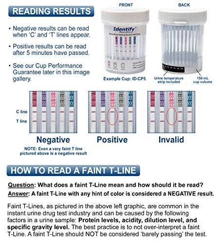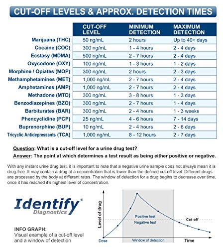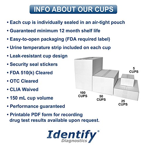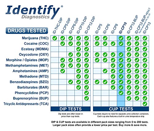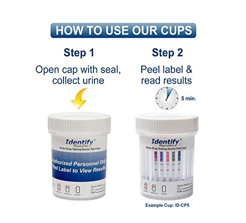 Studio : Medical Distribution Group Publisher : Medical Distribution Group Binding : Health and Beauty Product Description Identify Diagnostics 10 Panel Drug Testing Cup - Instantly Test for 10 Different Drugs. Model # ID-CP10. Available in packs of 5, 10, 15, 25, 50, 100, or 200 cups. Buy more and save more. The current expiration date for this drug test cup is on or better than: JUNE 30, 2019 Identify® Diagnostics drug test cups were created with quality, accuracy, price as key features. This 10 panel cup is one of several available versions trusted by medical professionals home drug testers across the United States. ?These urine screening cups are FDA 510(k) Cleared, CLIA Waived, and Over The Counter (OTC) Cleared by the USA FDA having been held to a higher quality standard than non OTC cleared products. They also meet the SAMHSA standard for substance abuse urinalysis. This 10 panel drug test cup detects the following drugs at the below FDA recommended cutoff levels in human urine: THC - Marijuana 50 ng/mL OXY - Oxycodone 100 ng/mL PCP - Phencyclidine 25 ng/mL MOP - Opiates / Morphine 300 ng/mL (Six times lower than many other brands) MTD - Methadone 300 ng/mL MET - Methamphetamines 1000 ng/mL COC - Cocaine 300 ng/mL BZO - Benzodiazepines 300 ng/mL BAR - Barbiturates 300 ng/mL AMP - Amphetamines 1000 ng/mL Please view the image gallery on this page featuring images designed to help understand how to use the drug tests, read results, and other useful product info. Please Note: Occasionally a faint test line (T Line) may appear. Even a faint T line is considered a negative test result. Faint lines do occur from time to time throughout the instant drug test industry. The brightness of a T line can vary due to factors such as: protein levels, acidity, dilution, and specific gravity levels of a urine sample. 0