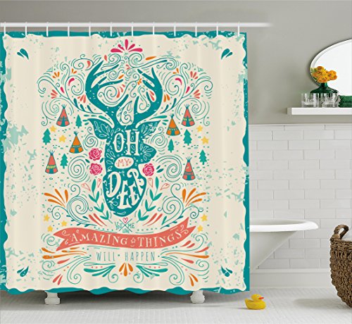 Vintage Decor Shower Curtain by Ambesonne, Reindeer with Antlers with Native American Tribal Element and Flowers Motivational, Fabric Bathroom Decor Set with Hooks, 70 Inches, Multi
