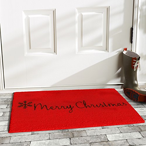 Brimming with holiday appeal, the Home & More Red Merry Christmas Outdoor Doormat lends a cheerful burst of seasonal color to your porch. Naturally crafted from coir, this red doormat features a black snowflake and script-style lettering. Densely textured, this weather-tolerant, vinyl-backed mat scrapes dirt, mud, and moisture off shoes before entering your house. Dimensions: 29L x 17W in.. Made of 70% coir and 30% vinyl. Tufted construction. Red and black colored doormat. Durable, dense fiber with vinyl backing. Weather tolerant and moisture absorbent. Does not mat down under high traffic. Centered script text with snowflake. For outdoor use.