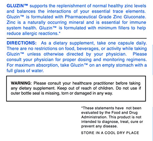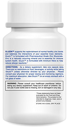 -. Feature : #1 Recommended Pharmaceutical Grade Zinc By the WDA Foundation / Does NOT contain any Allergenic Ingredients. Essential for the support of a healthy immune system. / Easier to swallow 25MG Zinc Gluconate capsule size (Capsule Size 3) / Formulated for reduced Gastrointestinal Irritation; No reported Stomach Ache / Shipped to over 96 countries worldwide. When you think Zinc...Think Gluzin!