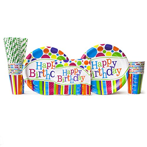Bright and Bold Party Supply Pack for 16 Guests: Straws, Dinner Plates, Luncheon Napkins, and Cups (Bundle for 16)