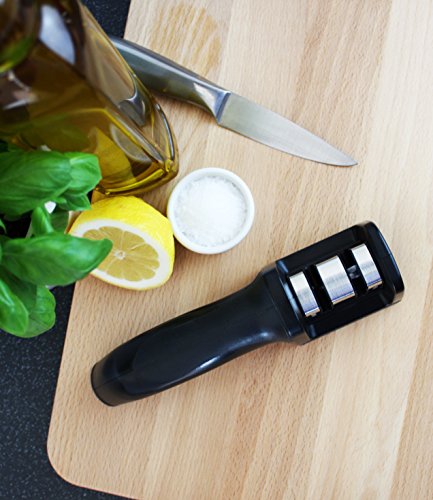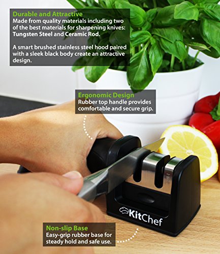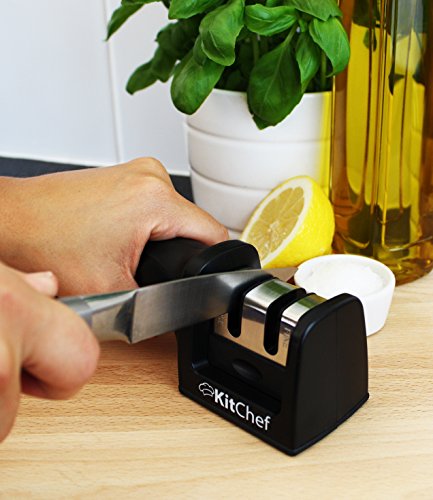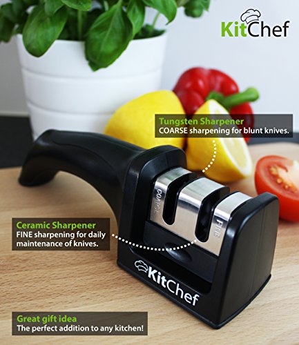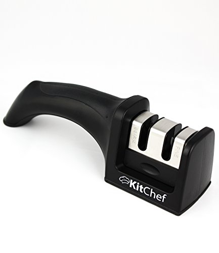 KitChef Premium Two-Stage Knife Sharpener | Ergonomic Easy Grip Handle and Non Slip Base for a Steady Hold and Safe Use | For Left or Right Handed People (Black)