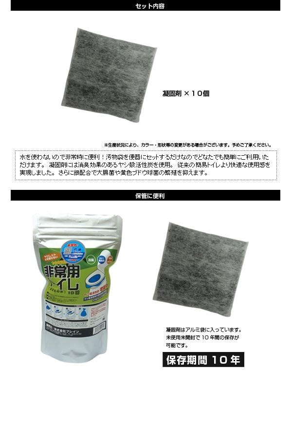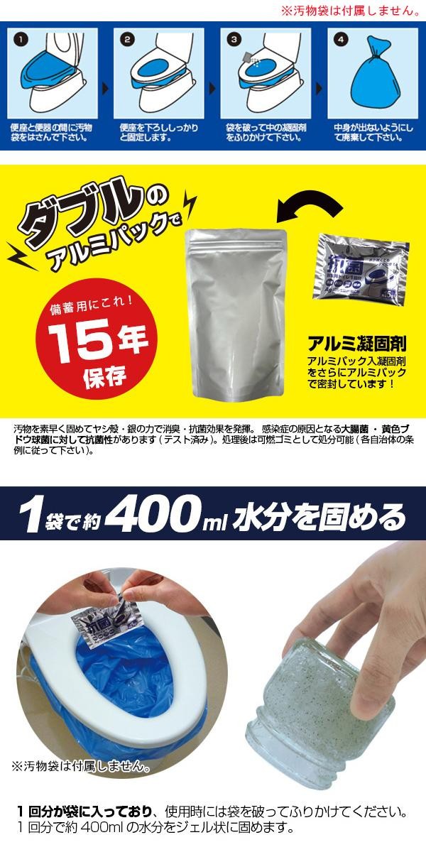 | 水が使えない状況でも汚物袋(別売)をかぶせるだけで用を足すことができます。使用後に凝固剤をふりかけるだけで、ジェル状に固まりゴミとして廃棄可能です。銀イオンを配合しているので抗菌作用があり、感染症の原因となる大腸菌や黄色ブドウ球菌の繁殖を抑えます。ヤシ殻活性炭を配合。消臭効果があり快適に使用できます。 |