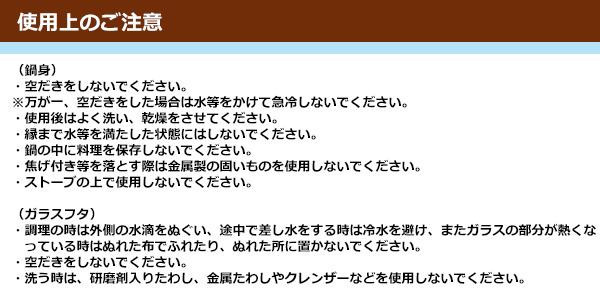 | 素材・材質 | 鍋身:ステンレス フタグリップ:シリコーンゴム フタグリップストッパー:ポリプロピレン ガラスフタ:耐熱ガラス |