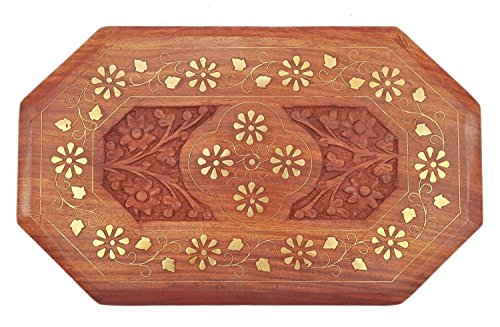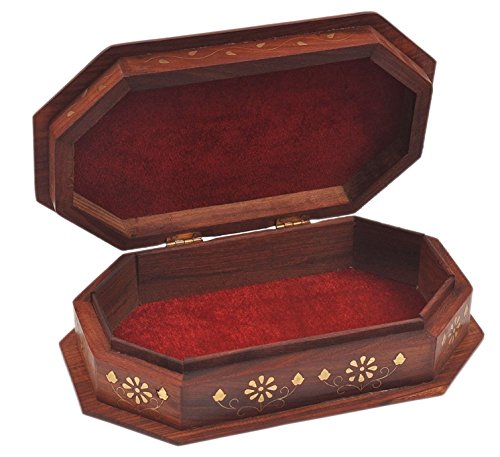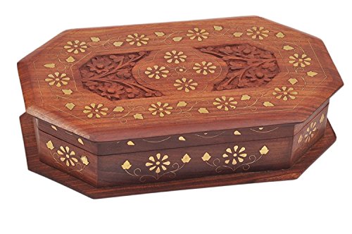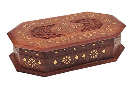 valentines Presents, Wooden Vintage Box Octal Shape Flower Inlay & Carving Design, Storage Box, Brown Color Wood Jewelry Box, Keepsake Jewelry Organizer Box 10 X 6 Inch