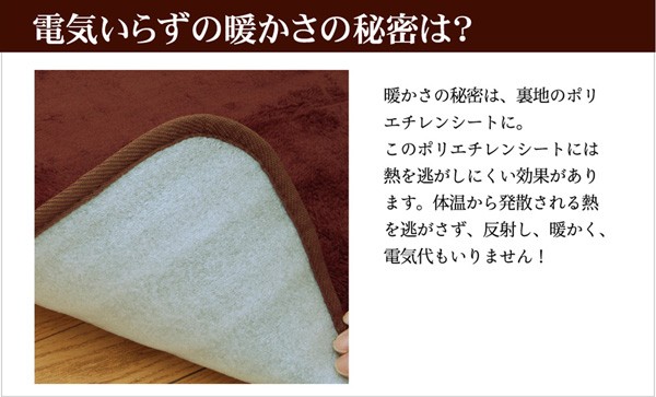 ポリエチレンシートを使用した蓄熱カーペットです。このポリエチレンシートには熱を逃がしにくい効果があります。体温から発散される熱を床下へ逃がさず、反射し蓄熱して暖かくなります。また床下からの冷気も遮断できるのが暖かさの秘密です。電気を使わずにあたたかくなる節電商品です。表地にはあたたかな肌さわりの生地を使用しています。ご家庭の洗濯機で丸洗い可能なウォッシャブルタイプです。