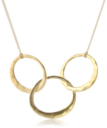 A trio of gold-toned hammered rings gives the Kenneth Cole New York Three-Circle Necklace its simple elegance and harmonious style. This pretty piece has a Zen-like quality that translates to easy versatility--you'll be hard pressed to find anything in your closet this necklace won't flatter. A slender chain creates the illusion of floating circles for a graceful, peaceful quality. For easy gift-giving and storage, this necklace arrives in a blue suede pouch.