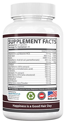 -. Feature : How Does It Work? Biotin is a B vitamin, also known as vitamin H. This nutrient plays a key role in regulating the health of many cells throughout the body, including hair and skin cells. Biotin helps to metabolize the building blocks of protein. Your hair and nails are made up of keratin, which is a form of protein. This is why biotin is a key active ingredient in so many hair care products, and one of the best hair and nail care supplements you can take! / Enjoy stronger hair and nails, fast growth, and luxurious locks. When you supply your hair and nails with the nutrients they need, you create an environment which is conducive to rapid growth and strong tissue. Your hair will be silky, smooth, and strong, and your nails will resist breakage. / Side-effect free. Our customers don't report the unwanted side effects that plague our competitors' products. This is because our formula is 100% natural and includes only high quality, pure organic ingredients. NO additives, fillers, artificial ingredients, wheat, gluten, nut, or animal products. Vegan-friendly and safe for all users! / Boost Your Hair With Biotin! When you take our healthy hair growth supplement, 15 natural active ingredients supply key nutrients to your hair and nails, including 5000 mcg of highest-grade Biotin. Our formula is scientifically formulated and backed by research trials which demonstrate these ingredients support healthy hair and nails. The Biotin Hair Formula blend includes a cornucopia of healthy organic ingredients like saw palmetto, horsetail, vitamin B-6, folic acid, Pantothenic Acid, and nettle root extract. / Buy one bottle for yourself and another for a friend or loved one. Share the joy of healthy, strong, beautiful, flowing hair and strong nails that resist breakage. Vitruvian Natural LabTM stands by every product we make. Our all-natural, research-backed health supplements are always made in the USA under strict quality-control standards. We ship our products do you directly and skip the middle man to keep our P.R.Ices low. Order today and your purchase will be protected by a 60-day full refund guarantee. If for any reason you are not satisfied within that time period, we will be happy to give you your money back. If you have any questions or concerns about Biotin Hair Formula, please get in touch with us. We want to help you get the most out of our all-natural hair growth supplement!