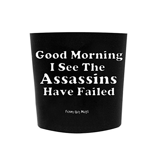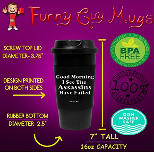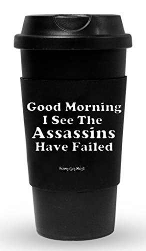Funny Guy Mugs Good Morning I See The Assassins Have Failed Travel Tumbler With Removable Insulated Silicone Sleeve, Black, 16-Ounce