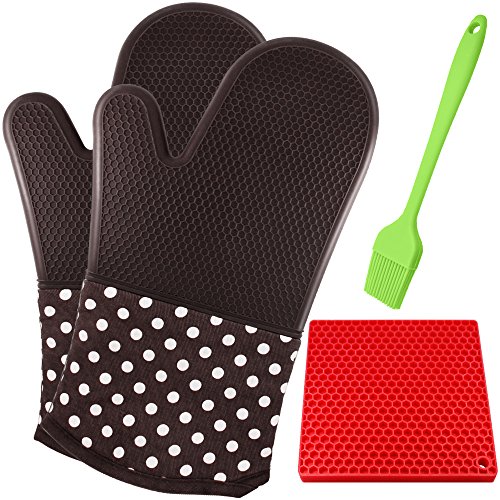 13" Heat Resistant Silicone Oven Mitts with Brush & Trivet Mat, SourceTon 1 Pair of Professional Grill Gloves with Extra Long Quilted Cotton Lining Liner for Kitchen Cooking Baking