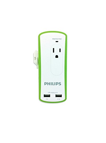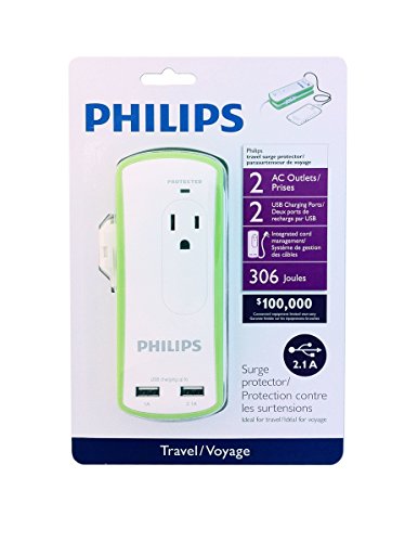 Philips 2-Outlet Mini Portable Travel Surge Protector with Dual 3.4A Smart USB Ports, Wrapped Cord Design [UL Listed]