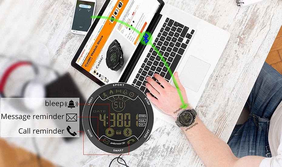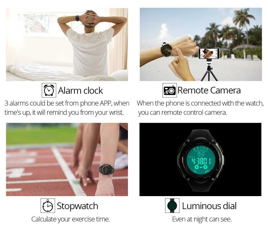 Function:Chronograph,Calendar,Remote Control,Noctilucent,Alarm Clock,Month,Passometer,Message Reminder,Call Reminder