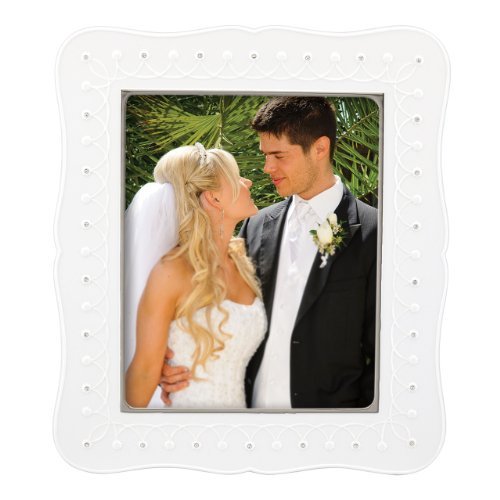 The scalloped rim of this elegant porcelain frame is edged in lustrous platinum. A raised motif adorns the frame, along with 26 diamond-bright crystal gems.