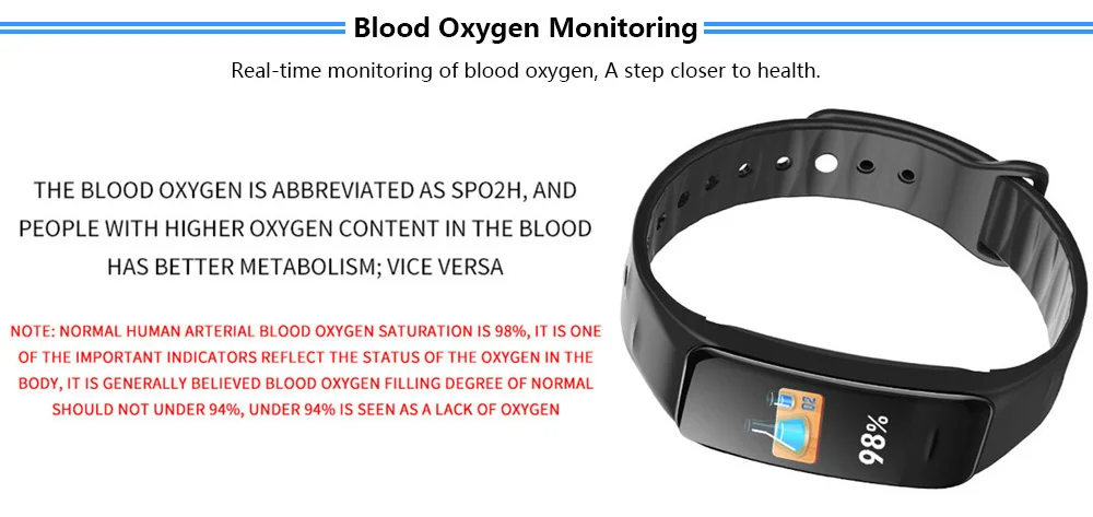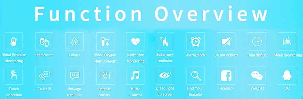 Function:Passometer,Sleep Tracker,Calendar,Push Message,Heart Rate Tracker,Blood Oxygen,Alarm Clock,Remote Control,Activity Tracker,Fitness Tracker,Social Media Notifications,Message Reminder,Call Reminder