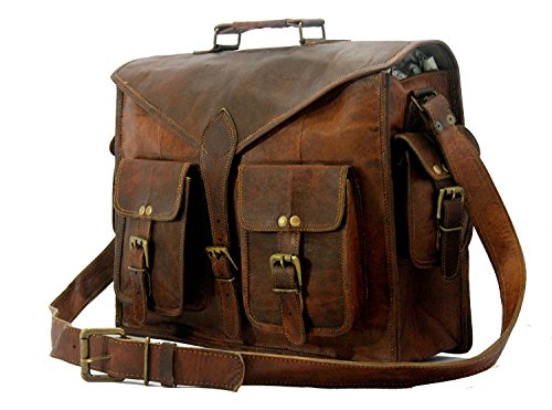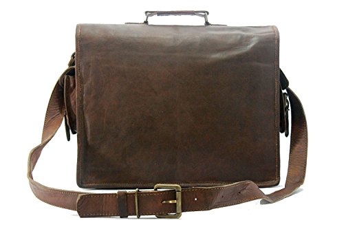 -. Feature : Dimensions: 15"x 11"x 4.5", 60 inch Adjustable Shoulder Strap. Fits upto 13" laptop easily. Walls are padded to keep the laptop safe. / Natural Process of tanning is used to give a rustic look. Made up of Goat hide with inner canvas lining. / 3 Compartment and 2 Zipper pocket and 2 small pocket in front and 2 small pocket in side. / Imported, Original handmade leather bag with brown color and metal fittings, / Classic retro style laptop/college messenger bag.This bag has enough room for your books, laptop, files and other essentials. Leave an impression on your colleagues and your friends by this classic unisex bag.