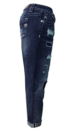 Make a statement in these distressed boyfriend cuffed jean by Miss Me. With the patched distressing, silver logo hardware and contrast stitching, these jeans scream comfortable. Paired with booties or heels, you will be the envy of the crowd!Feature