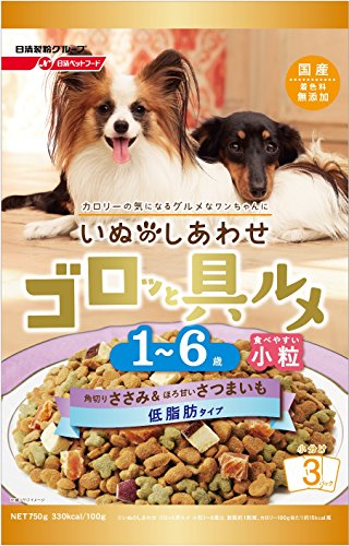 原材料:穀類(小麦粉、ホミニーフィード、とうもろこし、コーングルテンミール、玄米パウダー、脱脂米糠)、肉類(ミートミール、チキンミール、チキンレバーパウダー、鶏ささみ)、大豆ミール、油脂類(動物性油脂、フィッシュオイル、米胚芽油)、アルファルファ、魚介類(フィッシュミール、煮干粉、魚肉抽出物)、さつまいも、ビートパルプ、野菜類(パプリカ、キャベツパウダー、にんじんパウダー、ほうれん草パウダー、かぼちゃパウダー)、オリゴ糖、クロレラ、β‐グルカン、グルコサミン、クローブ、バジル、ローズマリー、ミネラル類(カルシウム、リン、ナトリウム、塩素、銅、亜鉛、ヨウ素)、ビタミン類(A、D、E、B2、B12、パントテン酸、コリン)、酸化防止剤(ローズマリー抽出物)