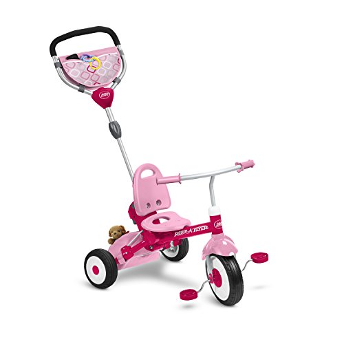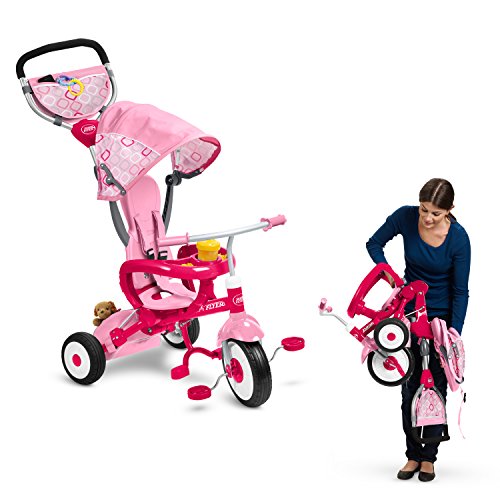 -. Binding : Toy -. Brand : Radio Flyer -. Color : Pink -. EAN : 0042385110455 -. Feature : Designed to fold in one easy step / Grows with your child-4 ways to ride and secure 3 point harness and high back seat for infant safety / Removable safety tray with cup holder. Removable canopy for UV protection / Adult Steer & Stroll adjustable push handle / Quiet ride tires, foot brake and foot rest -. IsAdultProduct : 0 -. Label : Radio Flyer -. Manufacturer : Radio Flyer -. Model : 445P -. MPN : 445P -. PackageQuantity : 1 -. PartNumber : 445P -. ProductGroup : Toy -. ProductTypeName : TOYS_AND_GAMES -. Publisher : Radio Flyer -. Size : 10-12 inches -. Studio : Radio Flyer -. Title : Radio Flyer EZ Fold Stroll 'N Trike Ride On, Pink -. UPC : 042385110455 -. Warranty : The product warranty is good within one year from the date of purchase. A dated sales receipt for proof of purchase is required. A two year warranty policy will be provided to all customers who register their product at radioflyer.com.