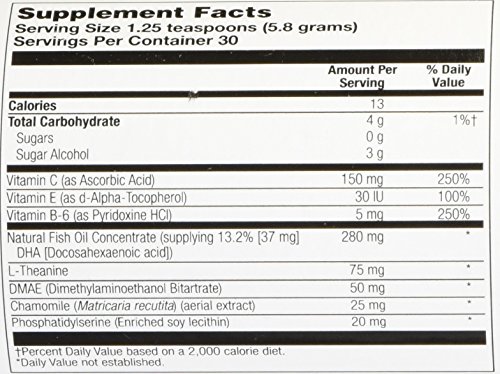 Solaray Total Calm Kid is a great tasting sugar-free powder that contains 37 mg of DHA plus phosphatidylserine and DMAE and is intended to provide nutritive support for brain health.