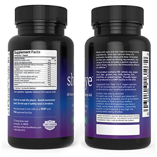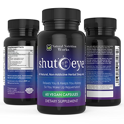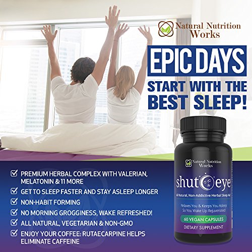 -. Feature : SLEEP DEEP OR WE WILL SEND YOUR $ BACK! Period. No hassles, no quibbling. We have a LIFETIME satisfaction guarantee. We aim to please, and we mean it! / SLEEP DEEP, WAKE REFRESHED! - You can quickly relax, ease your restlessness, and drift off into a deep, restful sleep. Wake up feeling rejuvenated and ready to face the day without the 'grogginess' you can get from many other sleep aids. / ENJOY YOUR COFFEE! Our unique formula includes the most potent and proven traditional sleep botanical remedies, but also includes the Caffeine eliminating Rutaecarpine. You will be surP.R.Ised at how quickly and how deeply you can sleep when the stimulative effects of Caffeine are neutralized. Shut-Eye is the ONLY natural sleep aid to include Rutaecarpine! / SAFE, HEALTHY, DRUG-FREE SOLUTION - You can rest assured knowing that Shut-Eye is made with natural, non-habit forming ingredients (unlike prescription solutions like Ambien). You can expect the best sleep of your life, without worrying about the nasty side effects of harsh chemicals that other sleeping pills sometimes have. / SAFELY AND EFFECTIVELY USED FOR CENTURIES - With our proP.R.Ietary formula we have combined the most potent ancient (Eastern & Western) herbal remedies for insomina & relaxation with the latest scientific research to create a "SYNERGISTIC SLEEP COMPLEX" Adding just the right amount of each of our 13 gentle ingredients amplifies their effectiveness: The result is a GREAT night's sleep. Compare us- No other Sleep Aid on Amazon has the breadth of ingredients.