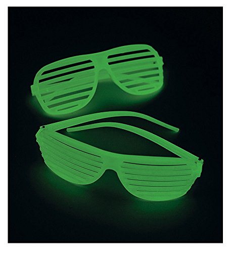 -. Binding : Eyewear -. Brand : Funny Party Hats -. ClothingSize : One Size -. Color : Colorful -. Department : womens -. EAN : 0632181222829 -. Feature : Our Glow in the Dark Shutter Shade Glasses Add a New Level of Fun to Your Party / These Glow in the Dark Shutter Shades are Perfect for Dancing in the Dark and Under a Blue Light / These Make Excellent Party Favors, Especially for a Futuristic Halloween / Good for Halloween, Costume parties and Themed Events. / Each Pair of Glasses Measures 5 1/2" Across the Face With 5 1/4" From Temple to Ear -. Model : am827 -. MPN : am827 -. PackageQuantity : 1 -. PartNumber : am827 -. ProductGroup : Apparel -. ProductTypeName : ACCESSORY -. Size : One Size -. Title : Plastic Glow-In-The-Dark Shutter Shading Glasses Costume Accessory -. UPC : 632181222829