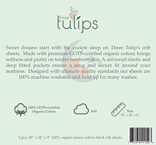- ♥Extra Durable 100% Machine Washable: Three Tulips organic cotton crib sheets are durable and long lasting. Simply toss it in the wash as often as needed. 2 pack set to insure you always have and extra crib sheet on hand.