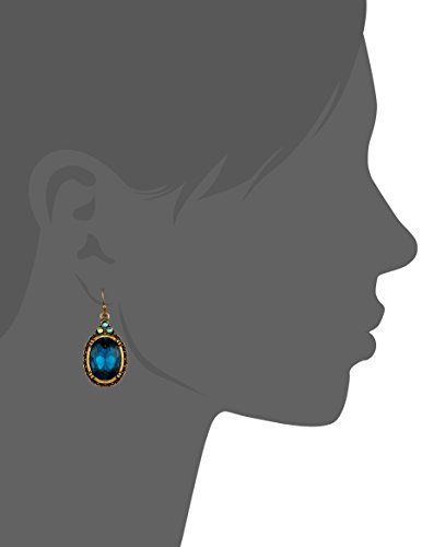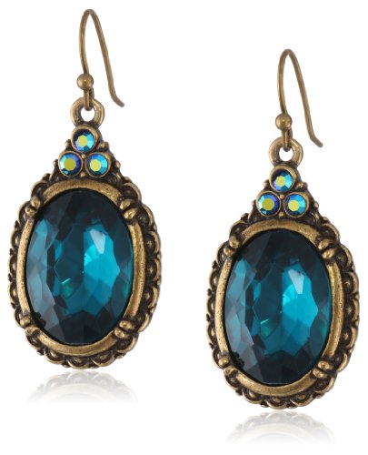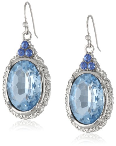 • Brass-tone drop earrings featuring oval blue zircon color center stones with iridescent crystal accents^Brass-tone wire fishhook backings^A stunning combination of vibrant color tones and vintage glamour, these earrings by 1928 Jewelry make a colorful, yet classic statement.^^Made in USA