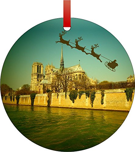 -. Title : Santa and Sleigh Riding Over The Notre Dame Cathedral, Paris, France-Vintage Style-Round Aluminum Christmas Ornament with a Red Satin Ribbon/Holiday Hanging Tree Ornament/Double-Sided Decoration/Great Unisex Holiday Gift!