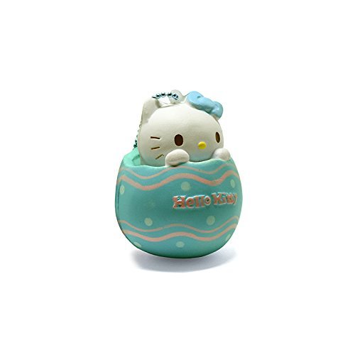 Hello Kitty is sitting in a Pastel Blue egg. She has a pretty blue bow on.