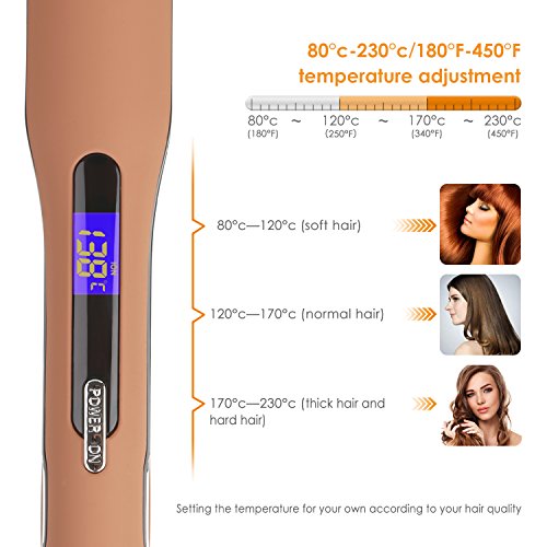 【Adjustable Temperature】 80°C/170°F ~ 230°C/450°F adjustable temperature to meet different hair needs. Temperature starts from 170°F - 300°F(80°C-150°C) for delicate or fine hair types, 300°F - 350°F (150°C-180°C) for normal hair, and 350°F - 450°F (180°C-230°C) for thick or coarse hair types.