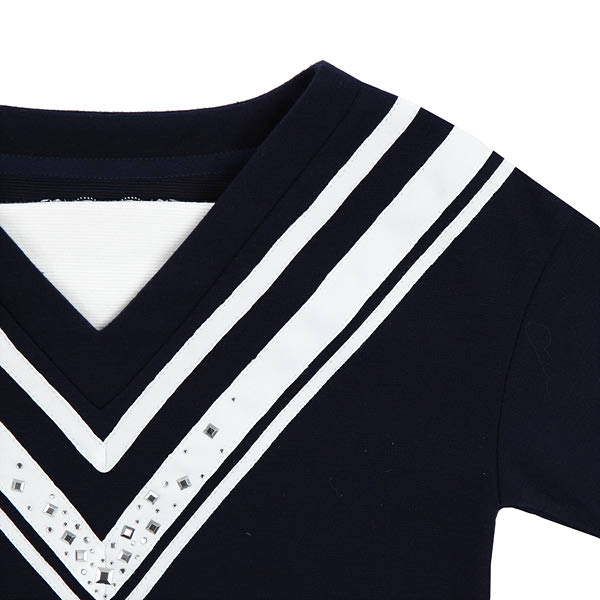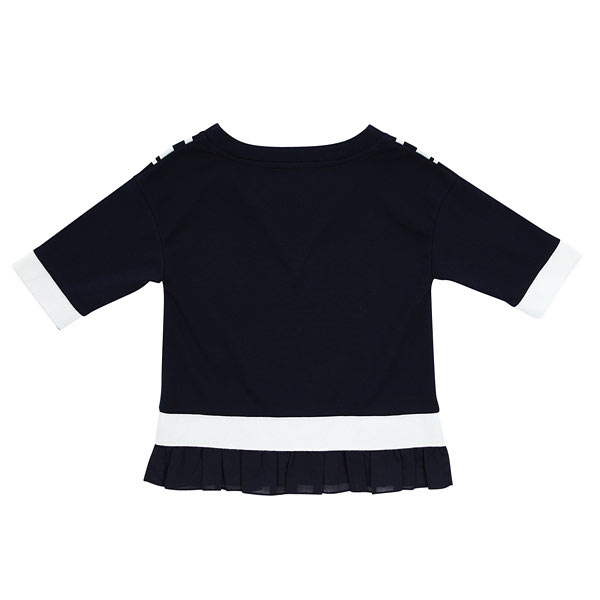 프릴배색 7부 롱티 V 넥을 따라 테이핑 라인이 돋보이는 7부 소매의 티셔츠 아이템. 밑단 아사소재의 프릴 디테일이 더해져 여아스러운 디테일을 살려준 것이 포인트. 살짝 A라인의 실루엣과 롱한 기장감으로 스키니 팬츠와의 코디가 좀 더 캐주얼한 느낌으로 잘 어울리는 스타일