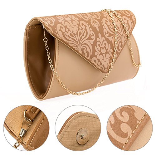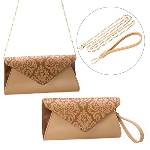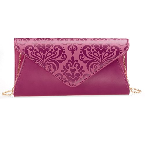 This damask pattern, two-tone clutch is the perfect accessory for a night on the town. The envelope style bag is made with faux leather and features an elegant design along the flap. The main compartment features soft lining with an open side pocket featuring our b.m.c branding patch. Add the removable wrist strap to transform the clutch into a wristlet, or add the chain to dangle over your shoulder or as a crossbody bag. A fashionable pairing for any look. *NOTE*: Due to differences between monitor displays, actual color may vary slightly from image. b.m.c is a registered trademark of Remi Collections LLC and is exclusively distributed by Bundle Monster. The b.m.c trademark is protected by US Trademark Law.Feature
