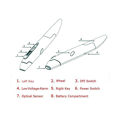 Adjustable 800/1200/1600 DPI optical sensor for smooth movement control.Pen shaped, especially suitable for handwriting input. Low voltage alarm function, reminds you to replace battery in time.Designed with a wheel for page turning during PPT presentation.