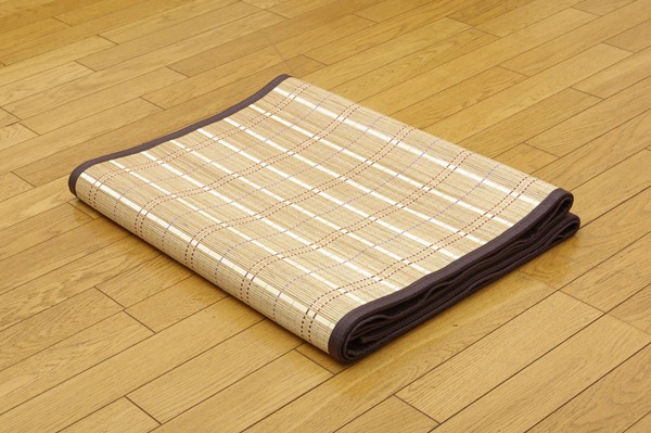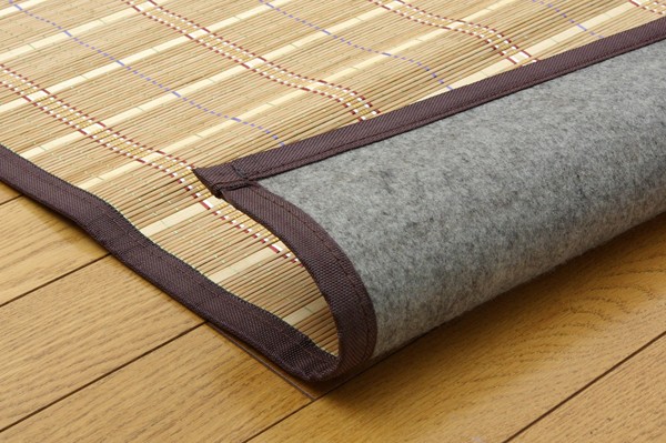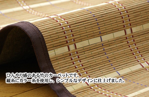 竹は耐久性に優れ、熱伝導率が高いため自然のひんやり感があります。縦糸にカラー糸を使用し柄を出したシンプルなデザイン織りです。60cm幅の竹をつないでおりますので、コンパクトの折りたたむことができます。裏には不織布を貼っていますので、フローリングでのご使用に適しています。竹は他の木材と比べると、格段に成長が早く(3~5年で成竹)、持続的生産が可能な環境に優しいサスティナブルな素材です。