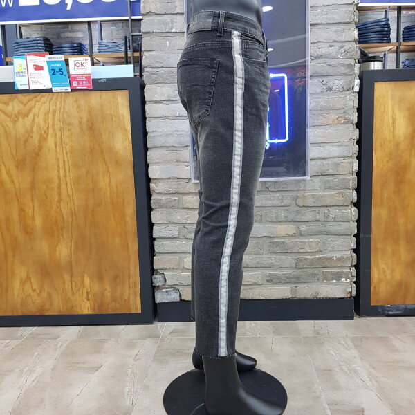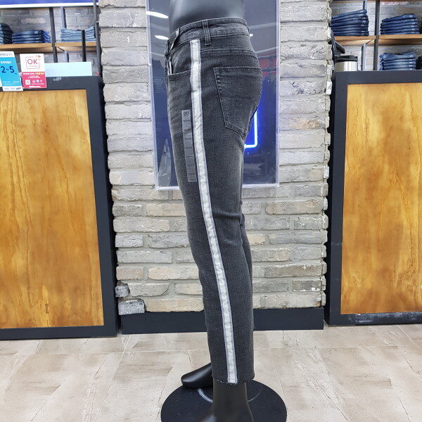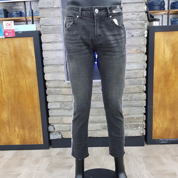 크롭 뉴슬림. 그레이컬러의 데님에 사이드 스트라이프 테이프가 장식된 스타일리쉬 아이템. (밑단 컷팅 형태) ( 남성사이즈->27(70),28(74),30(78),32(82),34(86)입니다.)