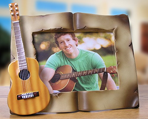 Feature : FATHER'S DAY GIFT. Any dad who loves to play the guitar would be proud to display this picture frame on his desk. Acoustic Guitar photo frame in a sheet music style presentation. Realistic brown acoustic guitar has real guitar strings. / 4 x 6 PICTURE FRAME. Nice frame to put a picture of your favorite guitarist in it. Perfect for your dad, father, brother, boyfriend, sister, cousin, father-in-law, country star or a photograph of a vacation you took to NASHVILLE / GUITAR GIFTS. Finished in very realistic wood tones with a miniature guitar attached / MUSIC DECOR. Frame measures 8" x 6" and holds a 4" x 6" picture. Fun musician gift that comes with a white gift box decorated with red and black music notes