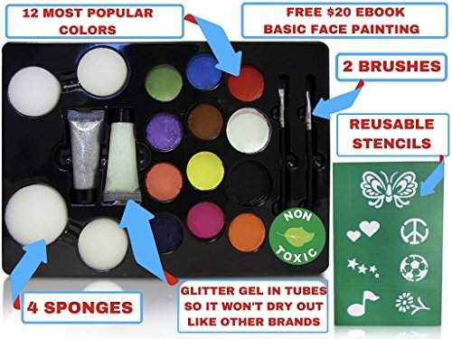 Title : Face Paint Kit for Kids (Paints 80 Faces) Professional Quality Children's Painting Kit with Stencils, 12 Colors, Glitters, Brushes, Sponges- With BONUS Tutorials and Ebook (Non-Toxic, Water Based)