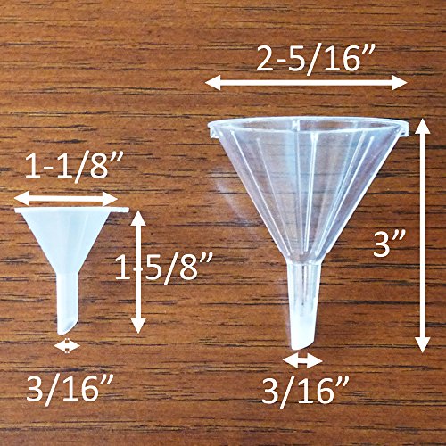 -. Feature : The Small Plastic Funnel Measures - 1-1/8 / The Larger Plastic Funnel Measures - 2-5/16 inches / Use the Funnels for Pouring Fuel into Firefly Refillable Candles, Essential Oils into Glass Bottles with Small Openings. Other uses include sand art, transferring fragrance oils or anything liquid. / The Bottom of the Opening is Very Small - Only 3/16 / The Larger Funnel is Great for Filling Firefly Liquid Pillar Candles which Hold a Large Amount of Fuel.