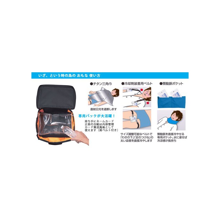 내용2:전용 순간 냉각 제×8개(예비2개)고, 냉각 제 장착용 벨트×4개,목 동맥 포켓×1매,티타늄(티탄) 삼각건×1매,송풍용 부채(백저 판)×2매
