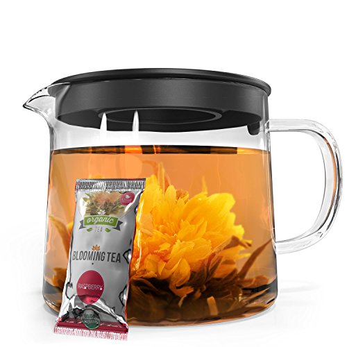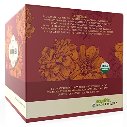 Kiss Me Organics Blooming Tea is the only flowering tea on the market made from 100% organic calendula flowers and all-natural fruit flavoring. Each bloom is hand sewn using the finest green tea leaves, and creates a beautiful display when steeped in hot water. Gift set includes a glass teapot and all 7 flavors of Kiss Me Organics Blooming Tea so you can brew up a pot of tea as soon as you open the box. This glass teapot has also been put through an annealing process so you can use it to boil water and it won't crack or shatter. Our tea is certified organic, and made from premium ingredients that are lab tested to ensure they're free chemicals. You'll be able to taste the superior quality of our all natural ingredients, and your body will love you for it! This gift set contains 1 glass tea pot 7 naturally flavored balls of Kiss Me Organics Blooming Tea, including cherry, peach, strawberry, black currant, raspberry, sugar melon, and cactus melon. It makes a great gift for any tea-lover in your life. *Green tea contains naturally occurring levels of caffeine and l-theanine. 0 |