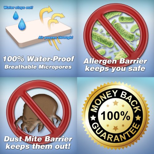 - Feature : Luxuriously Soft and More Comfortable than Terry Cloth Waterproof Mattress Covers or Bed Protectors / Ultra-Flexible, Hi-Tech Backing is 100% Waterproof, but Breathes Freely and is Completely Noiseless - NO Plastic Feel and NO Crinkling Sounds / Extremely Effective Dust Mite Cover Eliminates Dust Mites and their Allergens - Protects Your Family While Sleeping / Hypoallergenic - Helps Provide Relief for Those Suffering with Allergies, Asthma or Eczema / Fitted Sheet Style Protector fits Queen Size Mattresses up to 21" thick and is Machine Washable For Easy Cleaning
