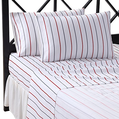- This 3 piece sheet set is an elegant, modern stripe with a touch of sophistication, the red and black stripes on a White ground are clean, crisp and welcoming