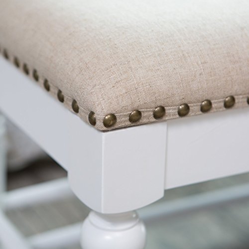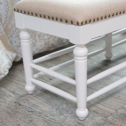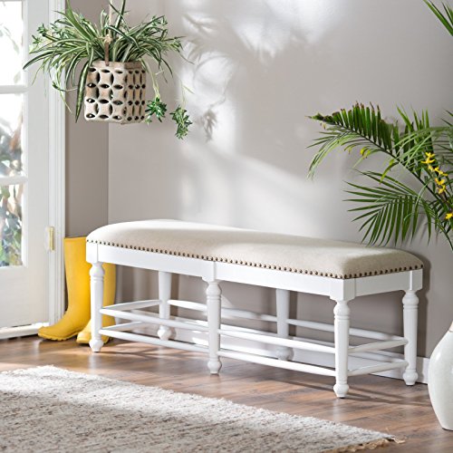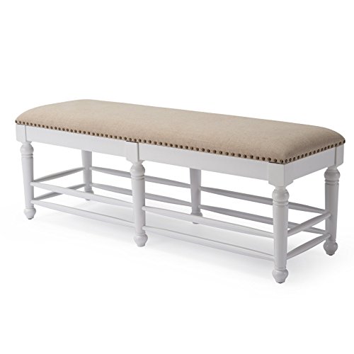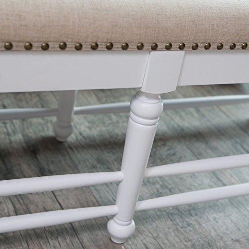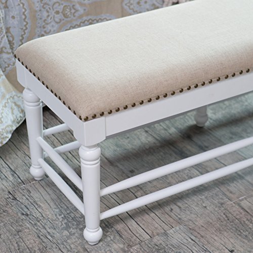 -. Feature : Dimensions: 52L x 17D x 19H inches / Birch wood frame / Seat upholstered in 100% polyester and features nailhead trim / Vanilla wood finish / Spindle leg design adds cottage charm